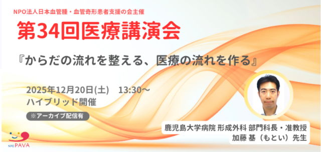 12月20日(土)に、NPO法人 日本血管腫・血管奇形患者支援の会主催の第34回医療講演会があります!