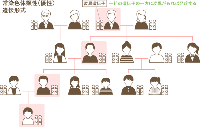 生殖細胞変異による遺伝性疾患の多くは、常染色体顕性(優性)遺伝形式をとります。この場合、親が病気であった場合、子が病気になる確率は50%となります。