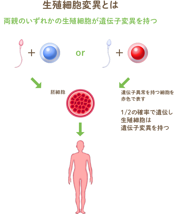 生殖細胞変異(germline mutation)とは、精子や卵子などの生殖細胞(配偶子)に存在する遺伝子変異のことです。生殖細胞変異は親から子へ遺伝し、その変異は子のすべての細胞に存在することになります。このため、生殖細胞変異による疾患は「遺伝性疾患」となります。