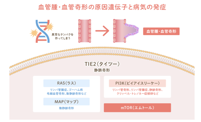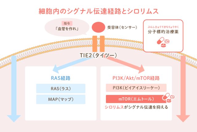 体細胞変異によって活性化されるシグナル伝達経路(PI3K/AKT/mTOR経路、RAS/MAPK/MEK経路など)を標的とした分子標的薬が、血管腫・血管奇形の新たな治療法として研究されています。
