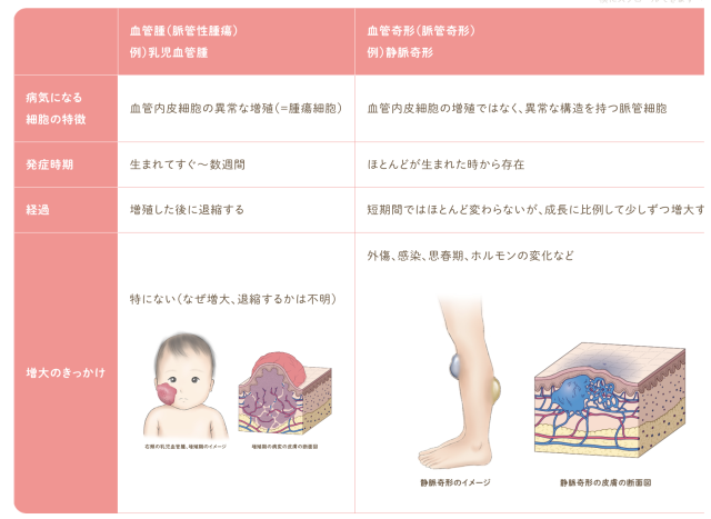 | 代表疾患 | 乳児血管腫 | 静脈奇形、リンパ管奇形、動静脈奇形など |