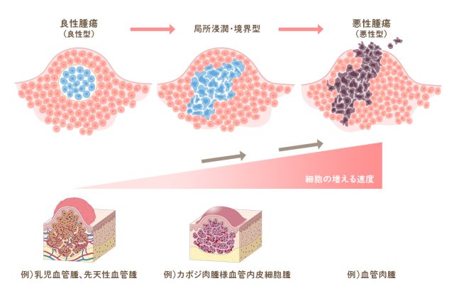 脈管性腫瘍の中では乳児血管腫が最も頻度が高く、小児期に見られる皮膚病変の中でも多い病気の一つです。乳児血管腫は良性腫瘍であり、多くは自然に退縮しますが、KHEなどの局所侵襲性腫瘍では積極的な治療が必要です。